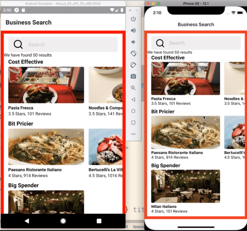 const SearchScreen = () => { ... return ( <> <SearchBar term={term} onTermChange={setTerm} onTermSubmit={() => searchAPI(term)} /> {errMsg ? <Text>{errMsg}</Text> : null} <Text>We have found {results.length} results</Text> <ScrollView> <ResultsList results={filterResultsByPrice('$')} title="Cost Effective"/> <ResultsList results={filterResultsByPrice('$$')} title="Bit Pricier"/> <ResultsList results={filterResultsByPrice('$$$')} title="Big Spender"/> </ScrollView> </> ) }